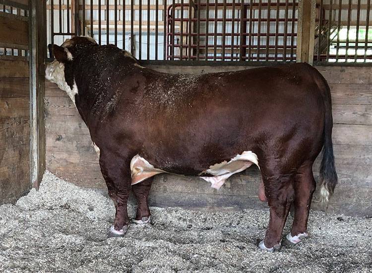 This is a super athletic, calving specialist, 6 year old bull. He’s a moderate sized bull that works great on first-calf heifers. He’s out of S109 whos transformed the breed and put a lot of functional udders into the industry. His granddam is LAKE LADY 225U, one of Bob Goble’s most favorite donor cows in Michigan. We’ve used him with a lot of success and we have many high performing daughters in the herd, but it’s time to move him to another outift. He does have a scur, but is very docile and fully halter-broke.